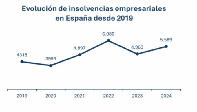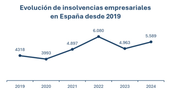 Con el foco en el último año, el análisis observa un incremento en concursos de acreedores en empresas del 12,6% respecto a 2023, con 5.589 insolvencias empresariales.