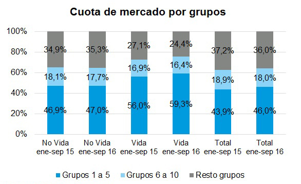 Si se analiza en Vida, No Vida y el total del sector las primas de los 5 primeros grupos del ranking en cada caso, se observa que su cuota de mercado ha aumentado en septiembre de 2016 respecto a septiembre de 2015 en Vida y el total del sector, mientras que en el caso de No vida prácticamente no hay variación, según los datos de ICEA. Si se consideran las primas de los siguientes grupos (del 6 al 10), se producen decrecimientos en las 3 categorías. Respecto al resto de grupos, crece ligeramente su peso en No Vida, mientras que desciende en Vida y en el conjunto del sector. La cuota de mercado de los 5 principales grupos del ranking por primas era a finales de septiembre del 47% en No Vida, 59,3% en Vida y 46% en el total del sector.