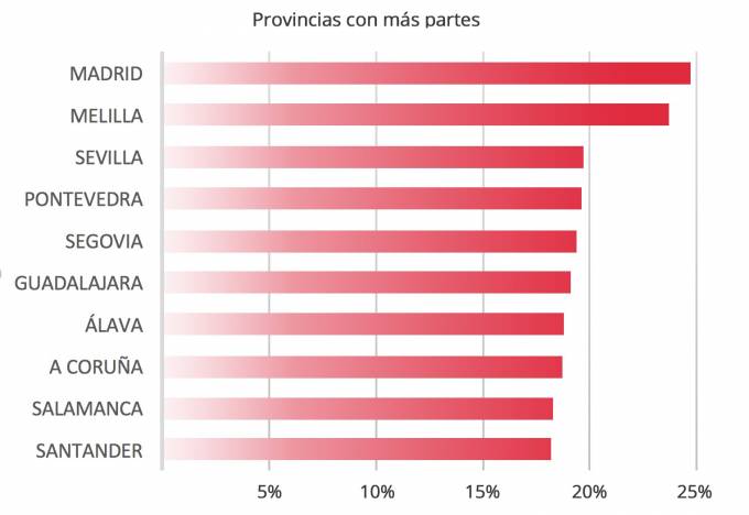 En total, se presentaron 1.136.000 partes, de los cuales casi un 25% corresponde a conductores madrileños. La razón de esta elevada cifra es "el gran volumen de tráfico" que hay en la capital de España. Por el contrario, los asegurados de Teruel, Las Palmas y Lleida son los que menos partes presentaron a sus entidades.