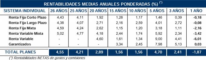 No obstante, en el largo plazo (26 años) los Planes de Pensiones alcanzan una rentabilidad media anual del 4,6% para el total de Planes. En el medio plazo (5 y 10 años) los Planes de Pensiones presentan una rentabilidad media anual del 4,7% y 1,6%, respectivamente.
