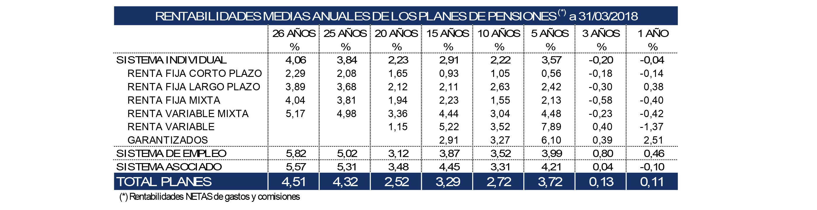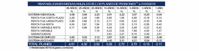 En el primer trimestre las correcciones "de cierta magnitud" en los mercados de renta variable han afectado al rendimiento de los Planes de Pensiones. Para el conjunto de planes la rentabilidad media a 1 año cerró en el 0,11%, según Inverco. En el largo plazo los rendimientos siguen siendo positivos: a 26 años, la rentabilidad media anual se sitúa en el 4,51% para el total de planes, mientras en el medio plazo, 5 y 10 años, es del 3,7% y 2,7% anual.