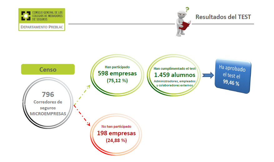 El Consejo General de los Colegios de Mediadores a través de su departamento Preblac ha examinado a administradores, empleados y colaboradores externos en materia de prevención de blanqueo de capitales y financiación del terrorismo. En esta primera fase han participado los 796 corredores de seguros calificados como microempresas adheridos al servicio Preblac del consejo. De ellas han querido participar 598, el 75,12%, con un total de 1.459 alumnos. La prueba de conocimientos ha sido superada por el 99,4% de los mismos y han acreditado conocimientos sobre la exigencia de esta ley. .