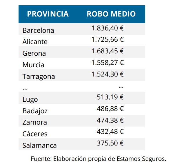 El coste medio del robo en los hogares oscila entre los 1.836 euros en Barcelona a los 375 en Salamanca, según datos del informe 'Los robos en viviendas españolas aseguradas. Datos 2020-2021' elaborado por Estamos Seguros. Alicante, Girona, Murcia y Tarragona son las siguientes provincias con mayor coste superando los 1.500 euros de media. Lugo, Badajoz, Zamora y Cáceres apenas llegan a los 500 euros de media por siniestro. Por norma general, los robos más caros se dan en provincias con una renta más alta que la media y que tienen mar. Especialmente, en aquellas que lindan con el Mediterráneo.