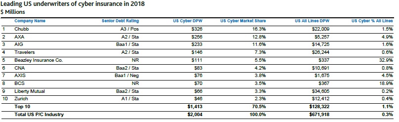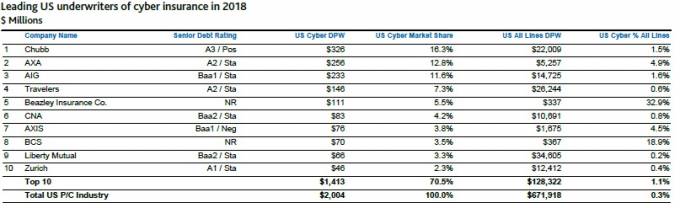 Actualmente , más de 40 grupos de seguros de los EE. UU suscriben el seguro cibernético como cobertura independiente, pero el mercado sigue concentrado entre las aseguradoras comerciales más grandes. Chubb Limited y AXA SA representan casi el 30% del mercado estadounidense. Y en total son 10 grupos aseguradores los que aglutinan dos tercios de mercado.