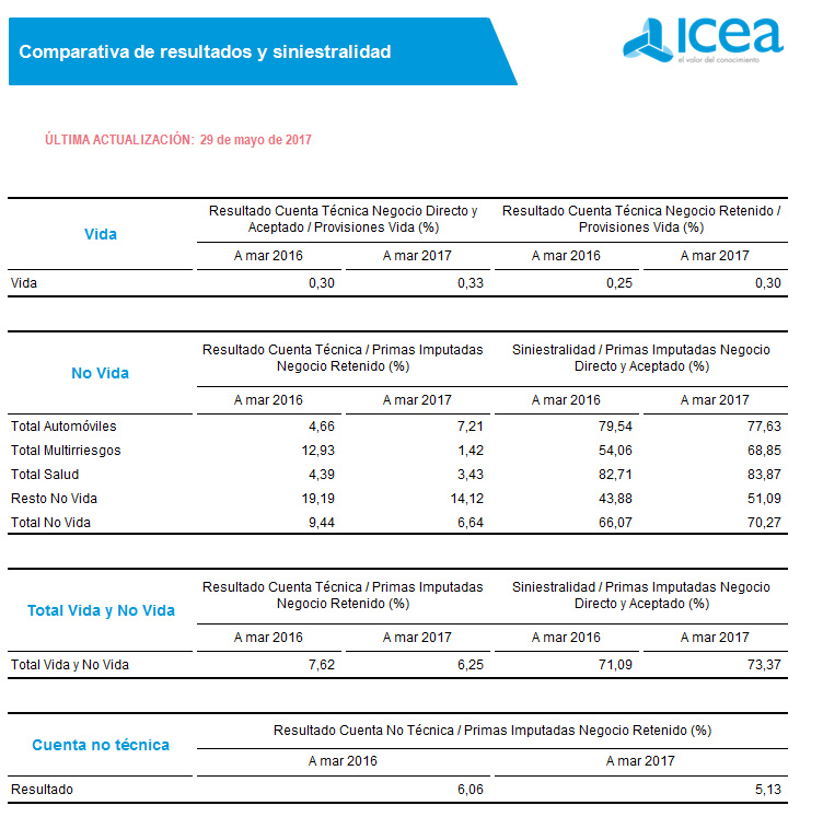 Por su parte, el informe destaca que la siniestralidad sobre primas imputadas del negocio directo y aceptado se ha incrementado en los 3 primeros meses del año hasta un 73,37%, lo que representa un aumento del 2,28% respecto a los datos de marzo de 2016.