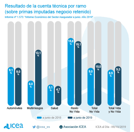 El resultado de la cuenta técnica del sector asegurador a cierre del primer semestre alcanzó el 9,3% sobre las primas imputadas retenidas. Esto supone 8 décimas más al registrado un año antes cuando la cuenta técnica fue del 8,5%, según los datos de ICEA.