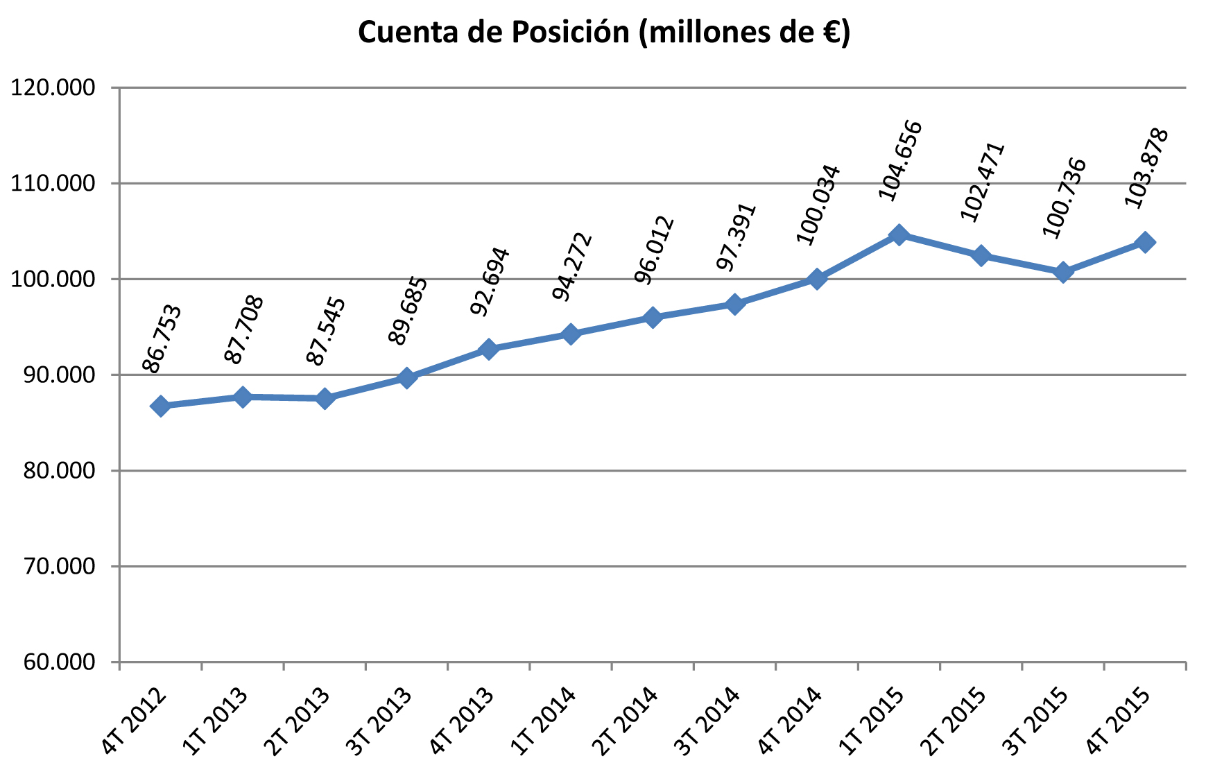 El patrimonio de los Fondos de Pensiones cerró 2015 en 103.878 millones de euros, con un crecimiento del 3,84% en el año. En el cuarto trimestre el importe de las aportaciones acumuladas fue de 4.419 millones de euros, un 4% menos. Los datos se incluyen en el Boletín de Información Trimestral de Planes y Fondos de Pensiones de la DGSFP, que sitúa en 9,907 millones el número de cuentas de partícipes, cifra muy similar a la de inicio del ejercicio (9,946 millones).