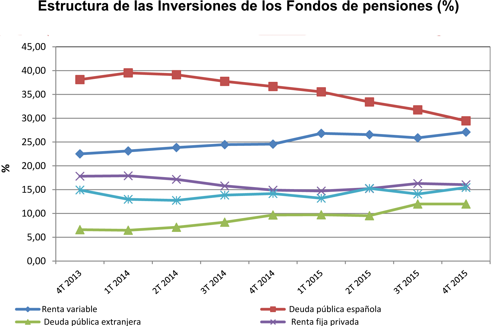 En comparación con un año antes y dentro de la distribución de la cartera media de los Fondos de Pensiones, destaca la reducción de la deuda pública española al bajar 7 puntos. La renta variable aumenta 2,52 puntos y la deuda pública extranjera, 2,3 puntos.