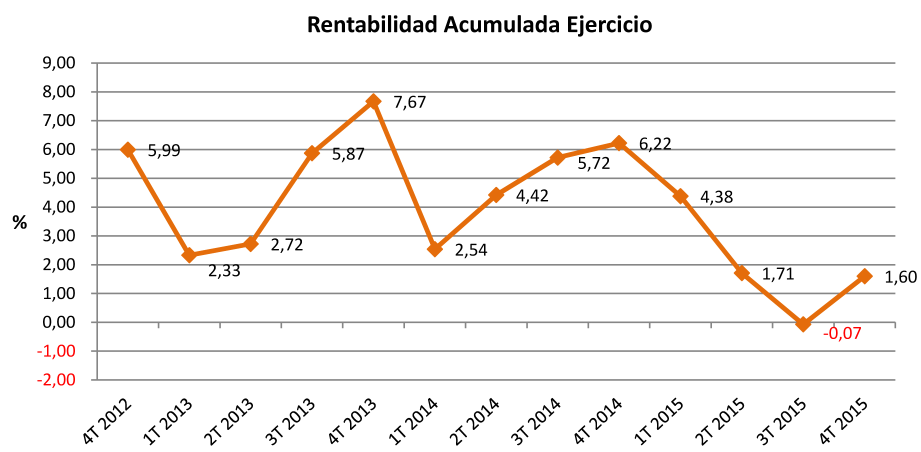La rentabilidad media acumulada fue reduciéndose hasta el tercer trimestre pero en el cuarto mejoró y permitió concluir el año con una rentabilidad anual positiva del 1,6%. La DGSFP indica que, sin embargo, ese rendimiento es mucho más bajo que el obtenido en los últimos tres años (5,99%, 7,67% y 6,22% respectivamente en 2012, 2013 y 2014).
