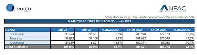 El mercado de turismos y todoterrenos ha logrado crecer en ventas también en junio. De hecho, el comportamiento ha sido notable. En junio, las ventas han superado las 101.085 unidades, lo que supone un incremento del 13,3% respecto al mismo mes del año anterior. Y, por primera vez en 2023, se rebasa la barrera de las 100.000 matriculaciones, impulsado por la mejora en la producción de vehículos y el crecimiento de las ventas del renta-car debido al periodo estival, según informan de manera conjunta Anfac, Faconauto y Ganvam.