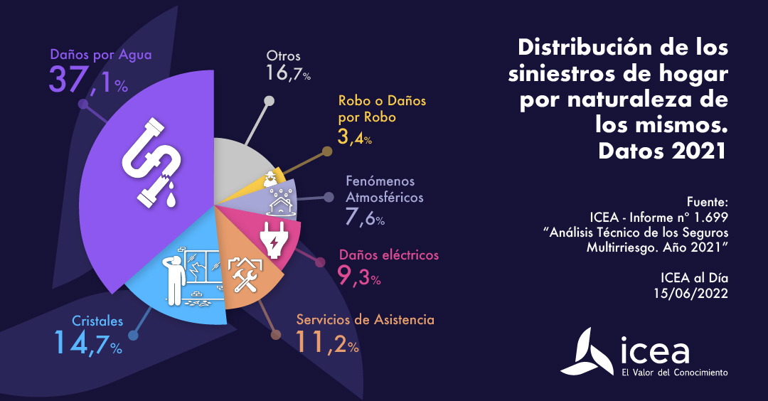 En 2021, el 37,1% de los siniestros declarados en el hogar fueron causados por daños por agua, siendo así el problema mayoritario. Por detrás se situaron los daños en los cristales, que representaron el 14,7% de los incidentes.