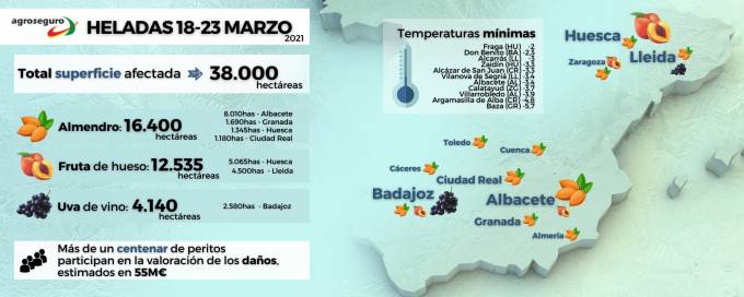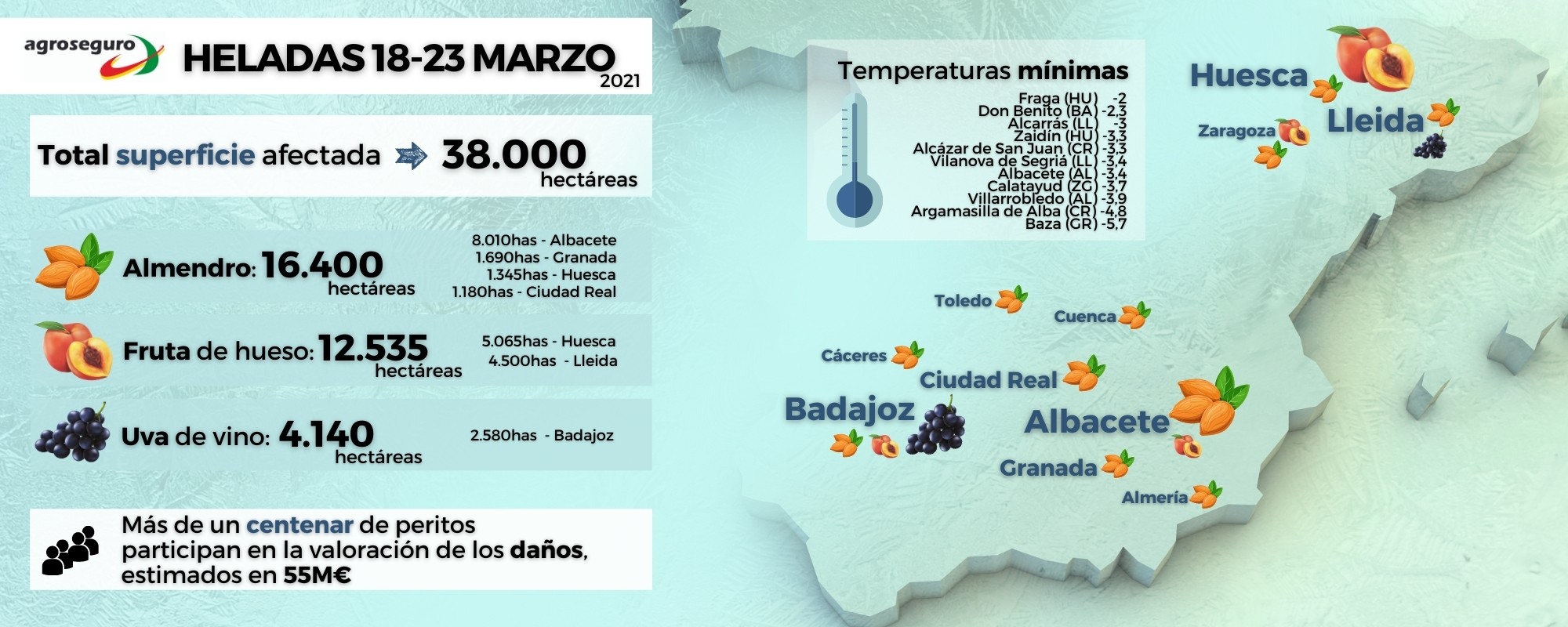Agroseguro confirma la gravedad de las heladas registradas durante el puente de San José. La estimación de daños alcanza los 55 millones de euros. En total, la superficie afectada se acerca a las 38.000 hectáreas aseguradas, repartidas entre más de 31.100 parcelas, en su mayoría de cultivos de frutales, almendro y uva de vino.