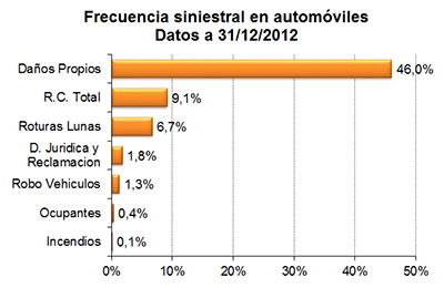 Los datos de ICEA al cierre de 2012 muestran que de nuevo Daños propios es la garantía que presenta la mayor frecuencia siniestral en Autos, con un ratio defrecuencia del 46% (47,4% el trimestre anterior). A bastante distancia se sitúa RC, con un 9,1%. “En cuanto al tipo de vehículos -detalla la asociación-, autocares es el que presenta tasas de frecuencia más elevadas en RC, Defensa Jurídica y rotura de lunas, m