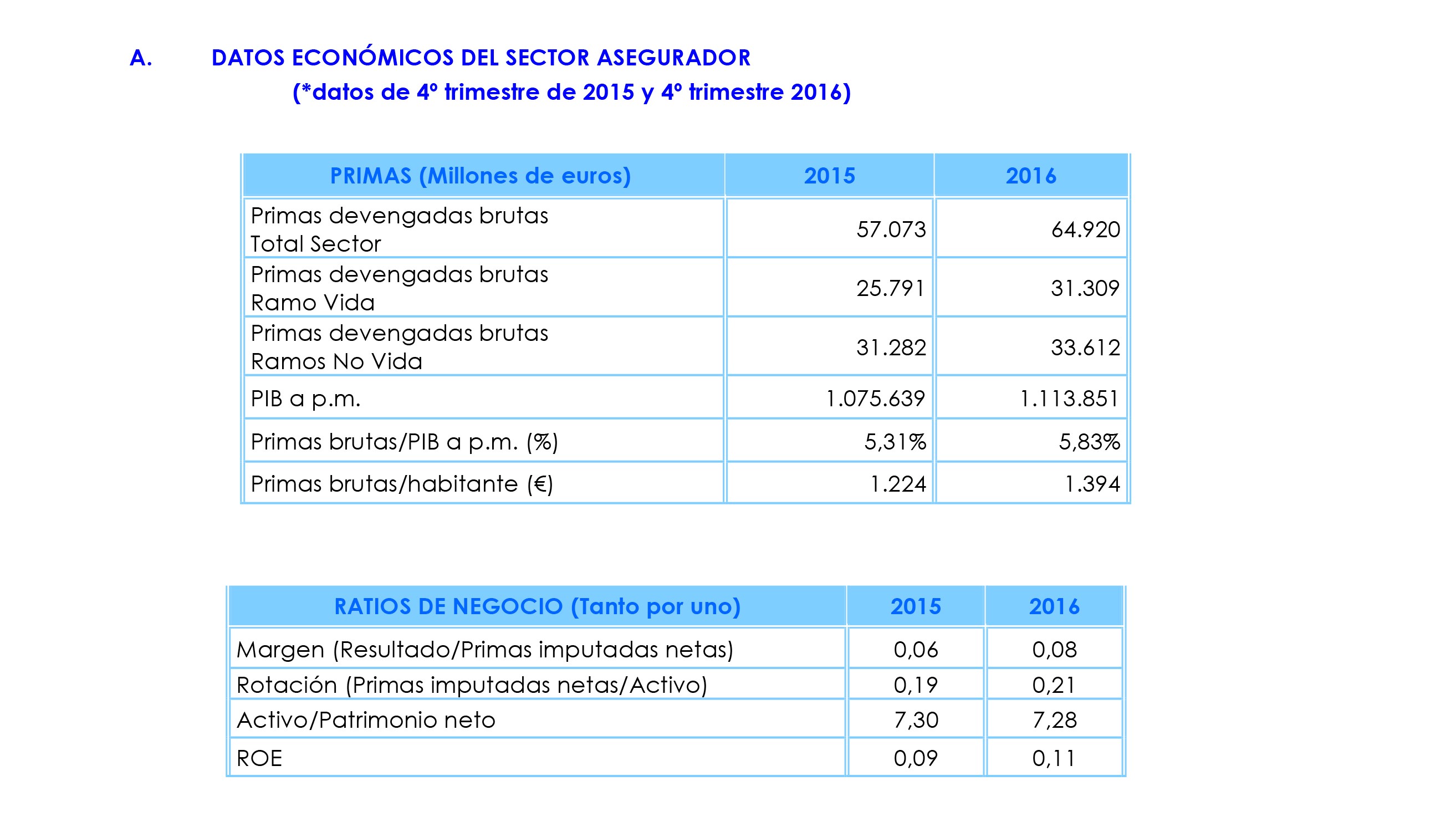 Los datos definitivos de la DGSFP sitúan el volumen de primas devengadas del sector asegurador en 2016 en 64.920 millones de euros, con un crecimiento del 13,75% frente a 2015. En el Informe de Seguros y Pensiones 2016 se recoge que la mejora del negocio se apoyó en el ramo de Vida, que creció un 21,39%, mientras el avance en No Vida fue del 7,45%.