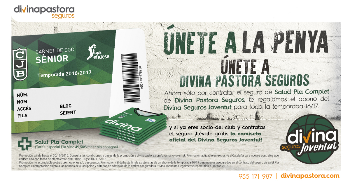 Divina Pastora ha puesto en marcha la promoción ‘Únete a La Penya’ para quienes contraten su producto de Salud ‘Pla Complet’. La aseguradora, como patrocinador principal del equipo Divina Pastora Juventud de Badalona, lanza esta promoción para sus clientes en Cataluña. Los abonos pertenecen a la zona Basquet del Palau Olímpic de Badalona y se podrán disfrutar viendo todos los partidos que el equipo dispute en casa durante la temporada. Por otro lado, el equipo patrocinado por Divina Pastora Seguros ha presentado también su camiseta oficial.