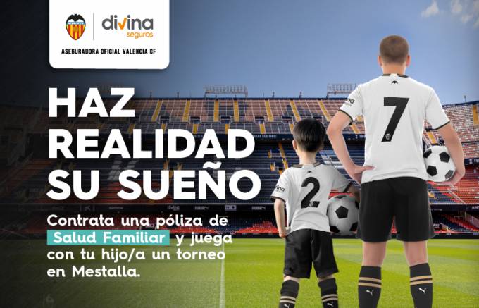 Divina Seguros, aseguradora oficial del Valencia CF, ha lanzado la promoción 'Mestalla os espera', por la que al contratar una póliza de Salud familiar (mínimo tres personas) regala una plaza doble para que el nuevo cliente juegue un partido de fútbol en Mestalla junto con su hijo o hija (menores de entre 10 y 17 años).