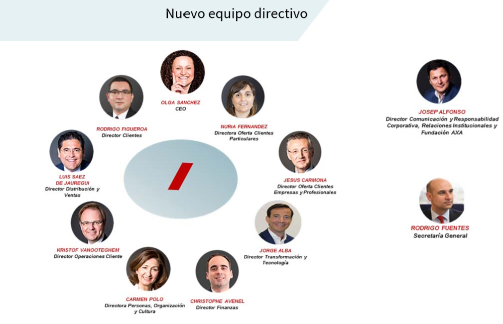 La nueva consejera delegada de AXA, Olga Sánchez, que asumió el cargo el pasado 1 de abril en sustitución de Jean-Paul Rignault, comunicó ayer a la entidad el nuevo equipo organigrama de dirección de la compañía y que será efectivo a partir del próximo miércoles, 1 de mayo.
