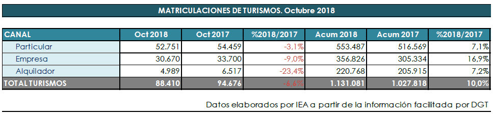 La caída fue común a todos los canales, si bien es el canal de empresa el que registra una caída más pronunciada. La reducción de las ventas de las empresas respecto del mismo mes del año pasado ha sido del 9%, hasta las 30.670 unidades. En el acumulado del año, la tendencia sigue en positivo para las ventas de turismos y todoterrenos, con un crecimiento del 10% y 1.131.081 unidades. Destaca el canal de empresas, con un 17% de crecimiento.