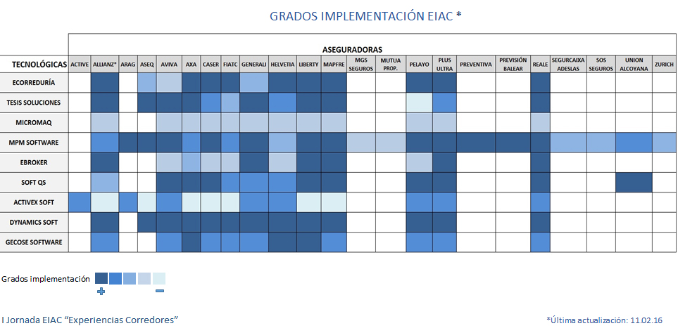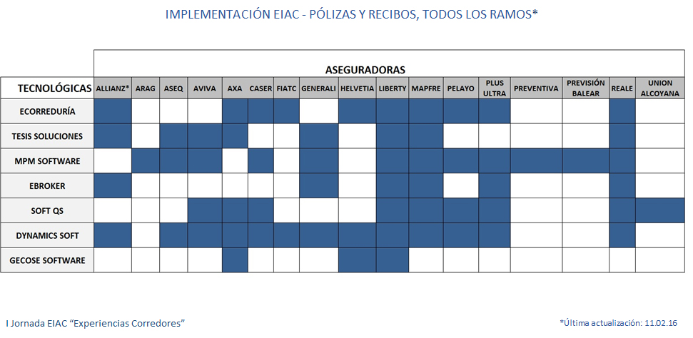 Las 5 principales tecnológicas que participan en el estandar, MPM, Te-sis Soluciones, E-Correduría, Grupo QS y Ebroker, destacaron que la implementación sigue su curso y cada vez más corredurías se unen a EIAC. Dejaron claro que es un intercambio de información en la fase actual, no de procesos de integración. Por ello la información sobre baja de pólizas o el cómputo de primas en tiempo real no es su objetivo ahora mismo.