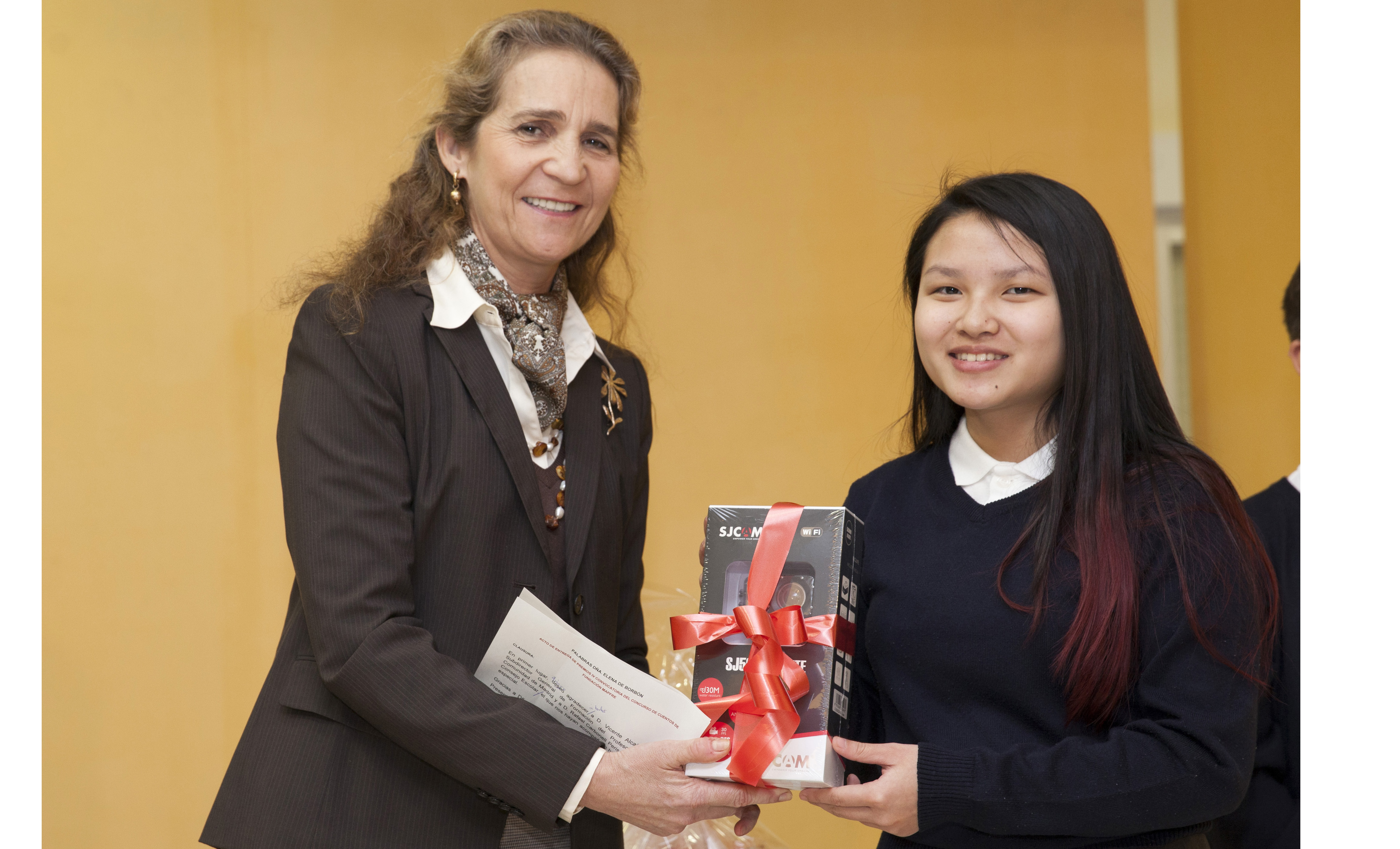 La Infanta Elena, directora de Proyectos de Fundación Mapfre, ha entregado el primer premio, en la categoría de Educación Secundaria, correspondiente al Concurso Internacional de Cuentos, que organiza dicha entidad desde hace 4 años en España y 18 países de Latinoamérica.