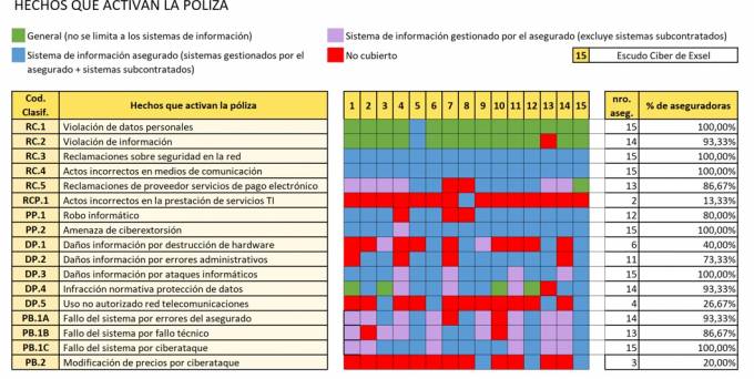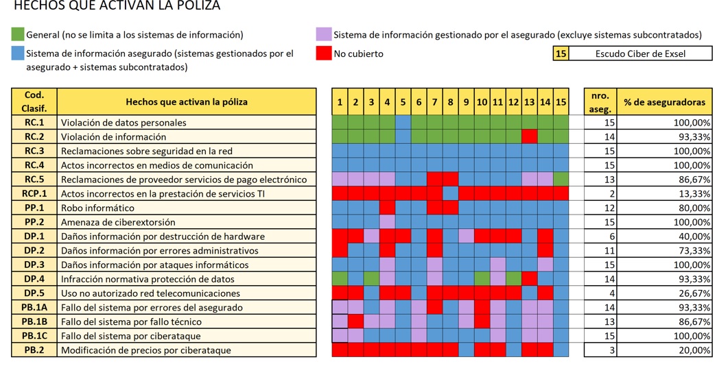 De los 17 ciberataques identificados en el estudio Escudos 2021 de Exsel que podían activar una póliza ciber, ninguna aseguradora española activa la póliza de ciberseguros en todas ellas; una sola entidad la activa en 16 hechos, dos en 15, y otras dos en 14.