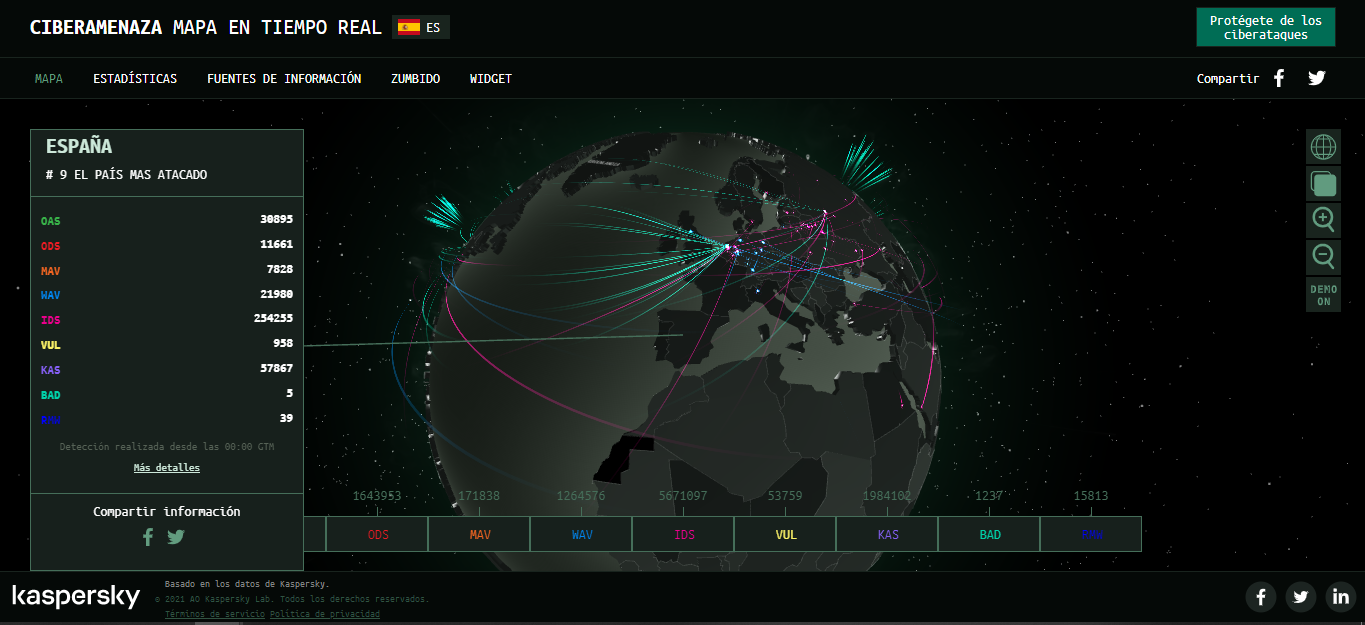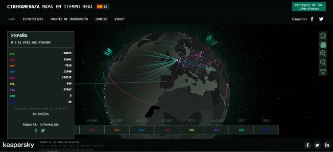 En el momento de la captura de la imagen, hace apenas unos minutos, España estaba siendo el 9º país más ciberatacado del mundo.