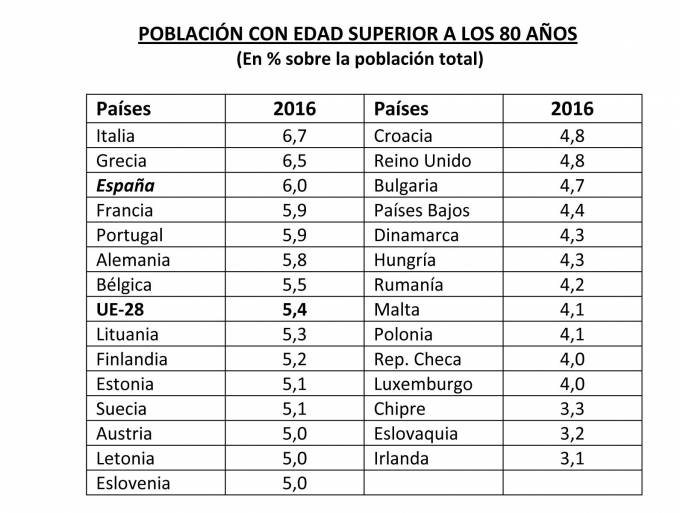 Italia ocupó el primer lugar con un 6,7% de población mayor de 80 años, mientras en Grecia era del 6,5%. En España las personas mayores de 80 años suponían un 6%. En cambio, los menores porcentajes se registraron en Chipre (3,3%), Eslovaquia (3,2%) e Irlanda (3,1%).