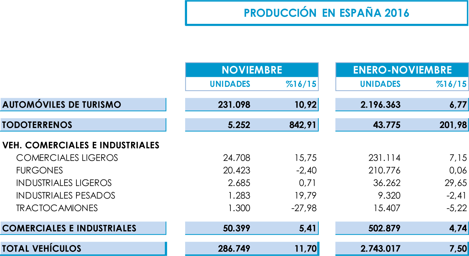 En el período enero-noviembre, el conjunto de fábricas españolas han producido 2,7 millones de vehículos, un 7,5% más que en el mismo período del año anterior. En noviembre se han fabricado 286.749 unidades, un 11,7% más, lo que ha supuesto una producción de más de 13.600 vehículos al día.