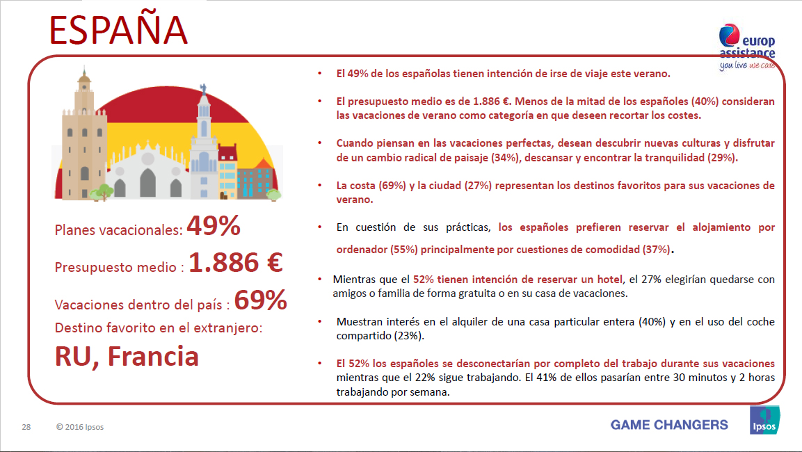 Centrándonos en España, según Verónica Herrando, directora comercial de Europ Assitance, se extrae del estudio que un 49% de la población saldrá de vacaciones, 11 puntos menos que en el año 2015, aunque los que lo hagan gastarán 167 euros más que el año anterior, alcanzando la cifra de 1.886 euros. En cuanto a la estancia media se sitúa en 2 semanas y 1 día, siendo nuestro propio país el principal destino para el 69% de los españoles. Reino Unido y Francia son los primeros destinos extranjeros.
