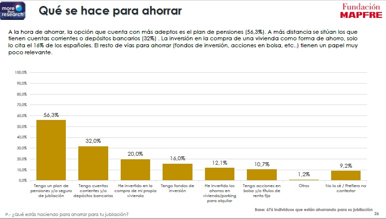 Pensando en la jubilación, a la hora de ahorrar, la opción que cuenta con más adeptos es el Plan de Pensiones (56,3%). A más distancia se sitúan los que tienen cuentas corrientes o depósitos bancarios (32%) . La inversión en la compra de una vivienda como forma de ahorro, solo lo cita el 16% de los españoles. El resto de vías para ahorrar (fondos de inversión, acciones en bolsa, etc..) tienen un papel muy poco relevante.