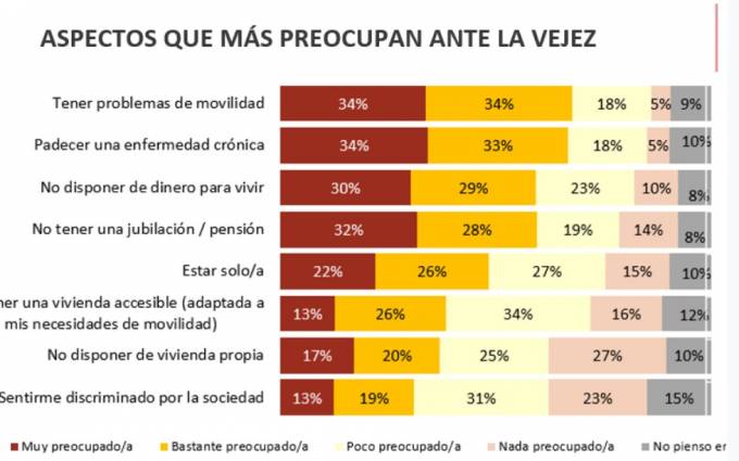 Están muy preocupados o preocupados un 68% de los encuestados por tener problemas de movilidad seguido de padecer una enfermedad crónica (67%) y no disponer de dinero para vivir (59%). Un 32% está muy preocupado por no tener pensión y un 22% teme a la soledad.