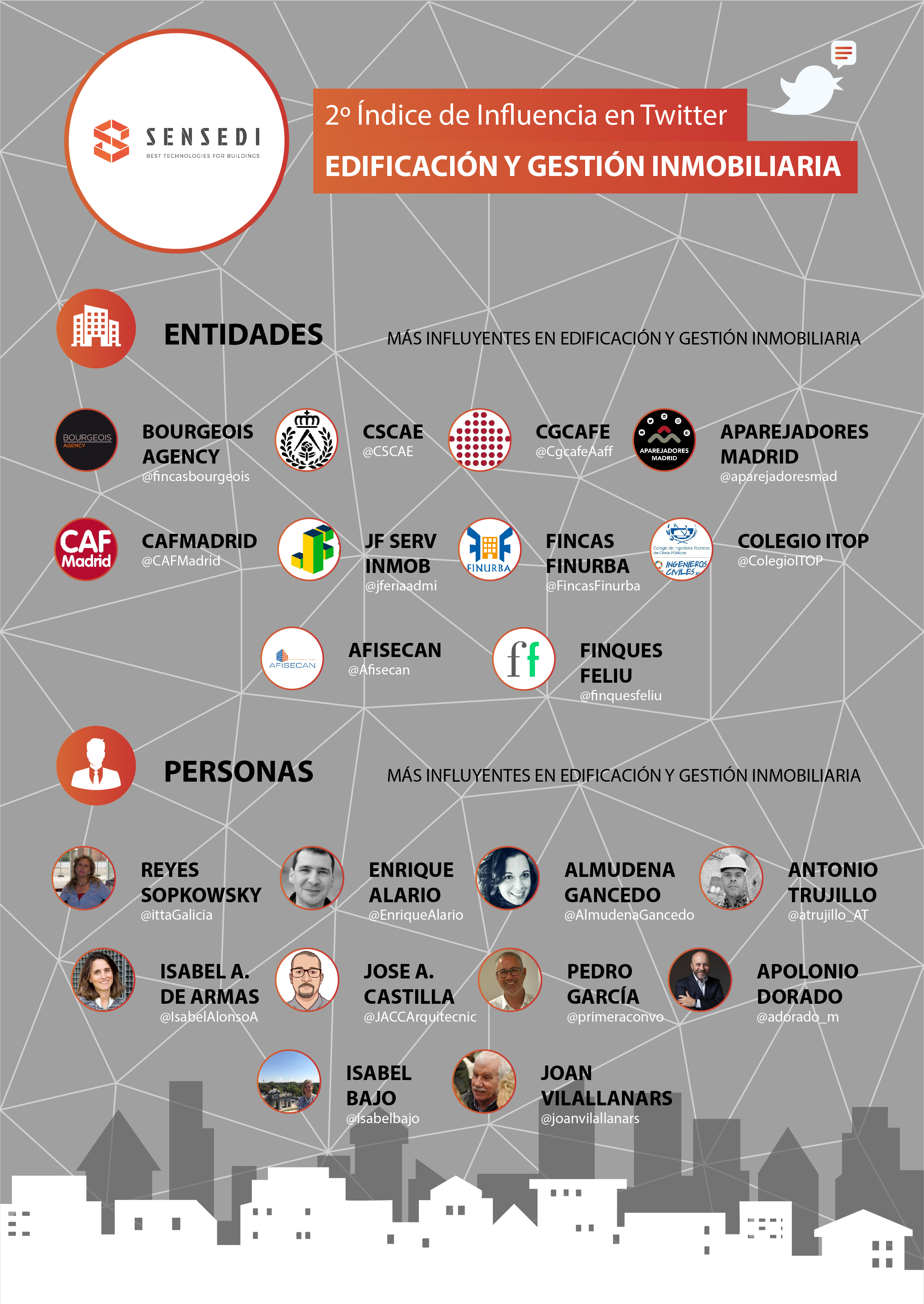 Tras un análisis de más de 70.000 conversaciones en Twitter durante el último año, Sensedi –compañía del Grupo Mutua de Propietarios- ha elaborado el II Índice de Influencia en Edificación y Gestión Inmobiliaria y ha desvelado cuáles son las cuentas más influyentes en temas de edificación y gestión inmobiliaria.