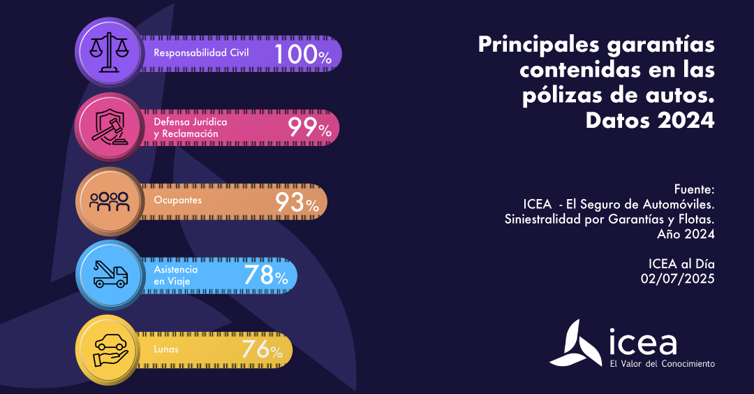Los datos de ICEA confirman que la mayoría de pólizas de seguros de Automóviles comercializadas en 2024 incorporan las garantías de Responsabilidad Civil (el 100%) y Defensa Jurídica (99%) y, en menor medida, la de Ocupantes (con una cuota del 93%). "Al margen de la garantía de Responsabilidad Civil, el resto de garantías son opcionales, observándose el mayor aumento en Otras garantías, que ha pasado de estar en el 33,1% de las pólizas al 37,5%; seguida de Daños propios, que sube del 39,2% al 40,9%", detalla ICEA.