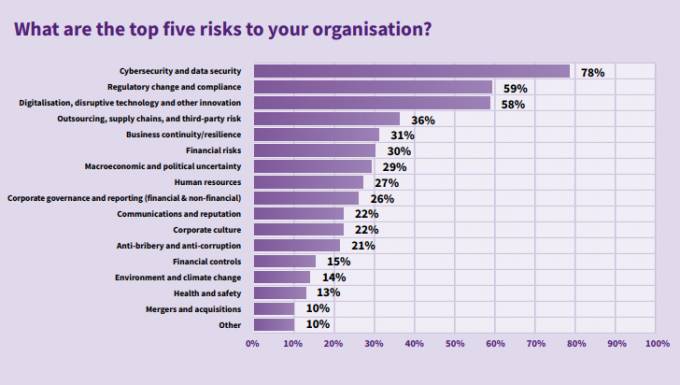 Los datos reflejan que para el 78% de los encuestados el riesgo principal será la ciberseguridad; le siguen los cambios regulatorios (59%) y la digitalización (58%). Por detrás de éstos aparecen cuestiones como la externalización, la continuidad de negocio, los...