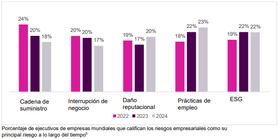 - Riesgo ESG. La gran cantidad de normativas ESG que se están publicando en todo el mundo está poniendo en alerta a las empresas y a su capacidad para operar en determinadas jurisdicciones. Según este informe, el 67% de los ejecutivos globales creen que la regulación ESG es demasiado compleja y un 70% reclama orientación a los reguladores para poder aplicarla correctamente ya que las compañías multinacionales se están encontrando normativas que compiten entre sí por lo que muchas veces los ejecutivos tienen que decidir qué normas cumplir y cuánto riesgo están dispuestos a asumir.