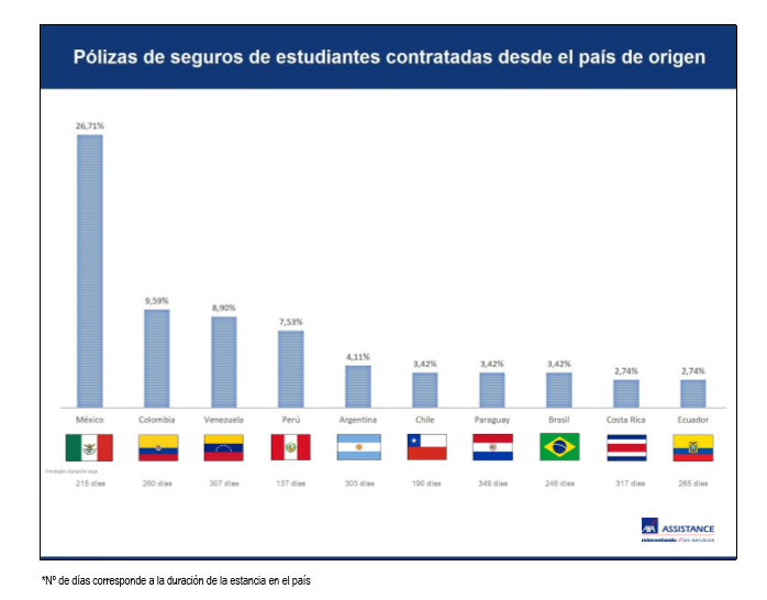 Según datos de AXA Assistance son los estudiantes mexicanos los que contratan más seguros para viajar a España, seguido de colombianos, venezolanos y estudiantes peruanos y argentinos. Sumando estos 5 países se contabilizan hasta el 57% de las pólizas de seguros de asistencia en viaje para estudiantes tramitados por la compañía.