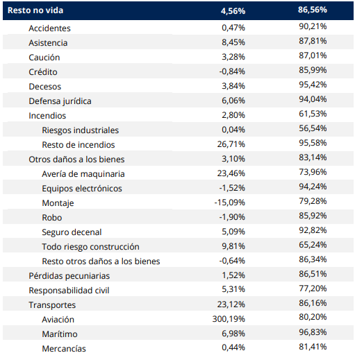 El resto de No Vida ha logrado un volumen de primas de 6.420 millones de euros, incrementándose un 4,56%. Todas las líneas de negocio que lo componen han crecido en el primer semestre excepto 5: Montaje (-15,09%), Robo (-1,9%), Equipos electrónicos (-1,52%), Crédito (-0,84%) y Resto otros daños a los bienes (-0,64%). Por el contrario, los ramos del resto de No Vida que más han aumentado en los seis primeros meses de 2025 son: Avería de maquinaria (+23,46%), Transportes (+23,12%) -impulsado por Aviación que ha repuntado un 300%-, Todo riesgo construcción (+9,81%) y Asistencia (+8,45%).