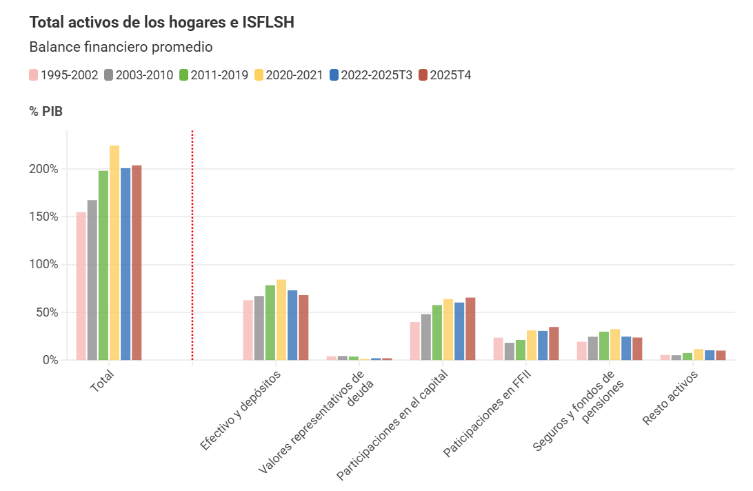 El ahorro total de las familias alcanzó los 3,44 billones de euros a finales de 2025. Destaca el fuerte incremento del ahorro en el último trimestre del año cuando los hogares españoles incrementaron su saldo en activos financieros en el 3,1%, unos 102.408 millones de euros. El aumento de este ahorro viene dado en gran parte por la buena evolución de los mercados financieros.