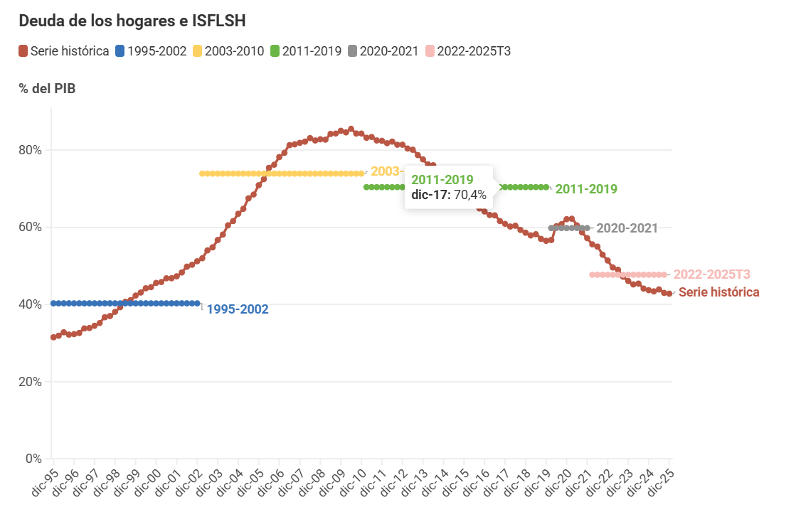 Las Cuentas Financieras de la Economía Española en el cuarto trimestre reflejan también el nivel de endeudamiento de hogares y empresas. El de los hogares se ha logrado rebajar al 42,8%, mientras que el de las empresas se baja un 62,6%, ambas cifras se encuentran en mínimos desde hace 25 años, indica el informe.