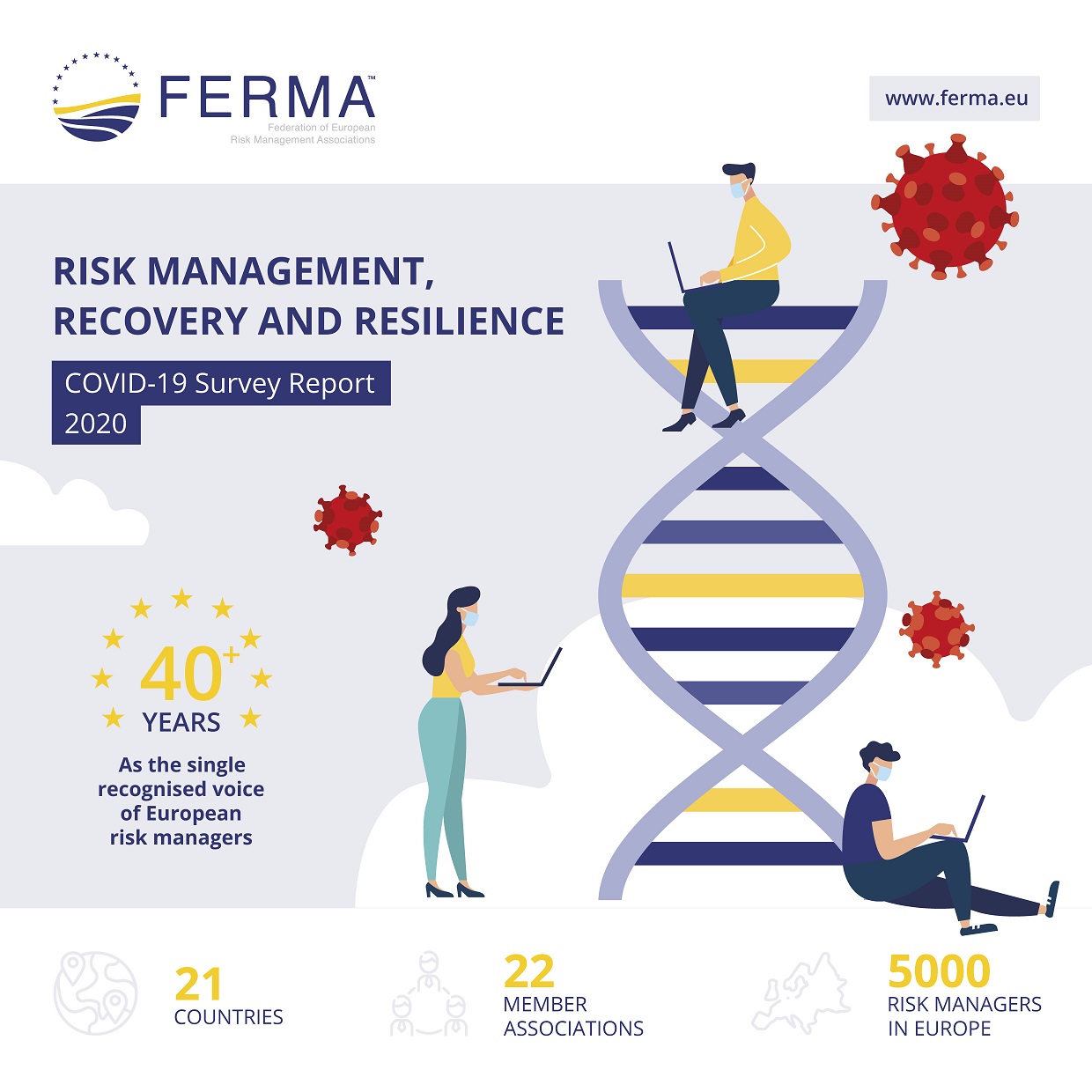 Los gerentes de riesgos europeos han ayudado a mantener la continuidad de sus organizaciones durante la crisis por la pandemia. Es la conclusión más destacada de la encuesta realizada por Ferma entre miembros de sus 22 asociaciones, en la que han participado 314 gerentes de riesgos de 21 países.