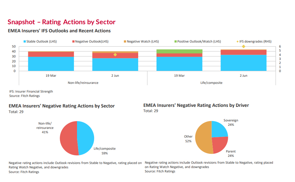 Fitch ha empeorado la calificación crediticia o impuesto alguna medida negativa (degradaciones o revisiones de perspectivas) al 34% de los grupos aseguradores de la región de EMEA que están bajo su radar, que ascienden a 84, incluidos reaseguradores. Así lo ha comunicado la propia agencia tras revisar su cartera entre el 19 de marzo y el 2 de junio de 2020 a raíz de la pandemia. Sin embargo, Fitch se ha mostrado satisfecha ya que la mayoría de las aseguradoras entraron en esta crisis del Covid-19 con cierto margen.