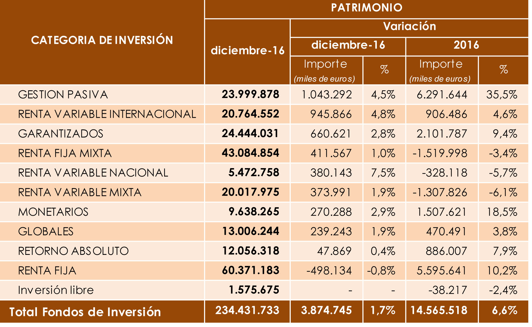 La rentabilidad se recuperó de los ajustes de los primeros meses de 2016: los fondos de inversión cerraron el año con una rentabilidad positiva del 1,25%. Todas las categorías concluyeron el año con rendimientos positivos (con excepción de los Monetarios), destacando los Fondos de Renta Variable Internacional (rentabilidades cercanas al 5%) y los de Renta variable española (en torno al 3%).