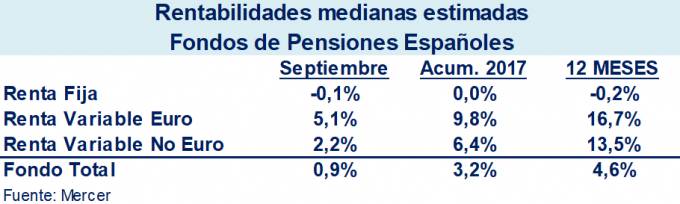 Los Fondos de Pensiones españoles han obtenido en septiembre una rentabilidad mediana del 0,9% gracias al buen comportamiento de la renta variable euro (5,1%) y de la renta variable no euro (2,2%), que compensan la caída de la renta fija (-0,1%). Son estimaciones facilitadas por el Servicio de Medición de Fondos de Pensiones PIPS (Pension Investment Performance Service) de Mercer.