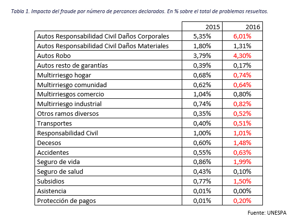 Gran parte de los intentos de fraude al seguro se producen en el ramo de Autos, hasta acaparar el 69,8% de los casos. Le sigue Diversos con el 24,7% y Personales con el 4,9%. Unespa calcula que el 6% de las lesiones por accidente de circulación esconden un fraude, ya sea por simulación o por una exageración del daño. En Vida son el 2% pero la razón principal de fraude es el engaño en la reclamación. En Subsidios y Decesos se considera que 1,5% de los casos son fraudulentos. Por coberturas los mayores intentos de fraude se refieren a la RC de daños corporales (6,01% del total), seguido de robo (4,3%), ambas en el seguro de Autos.