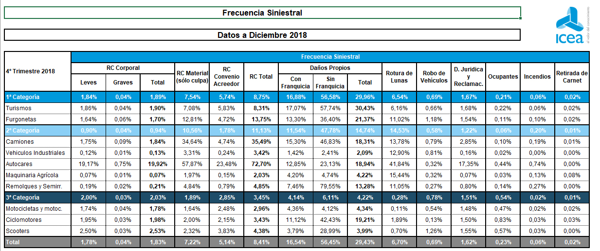 ICEA ha hecho públicos los datos de la frecuencia siniestral del ramo de Automóviles a 4º Trimestre de 2018. Respecto a un año antes los valores se mantienen estables, pero con ligera caída de la frecuencia. La más abultada en términos totales son los Daños Propios que retrocedieron un 1,01% respecto a diciembre de 2017; la RC Total descendió un 0,16% y la RC Corporal lo hizo un 0,09%.