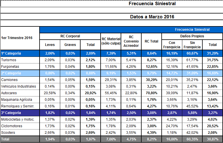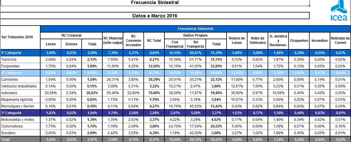 La frecuencia siniestral ha mejorado en el primer trimestre del año respecto a los datos de marzo de 2015, según los datos que ha dado a conocer ICEA. La menor frecuencia se observa en todas las garantías que contempla una póliza de Autos siendo la reducción más abultada la de Daños Propias sin franquicia que lo hace en un 4,6% interanual.