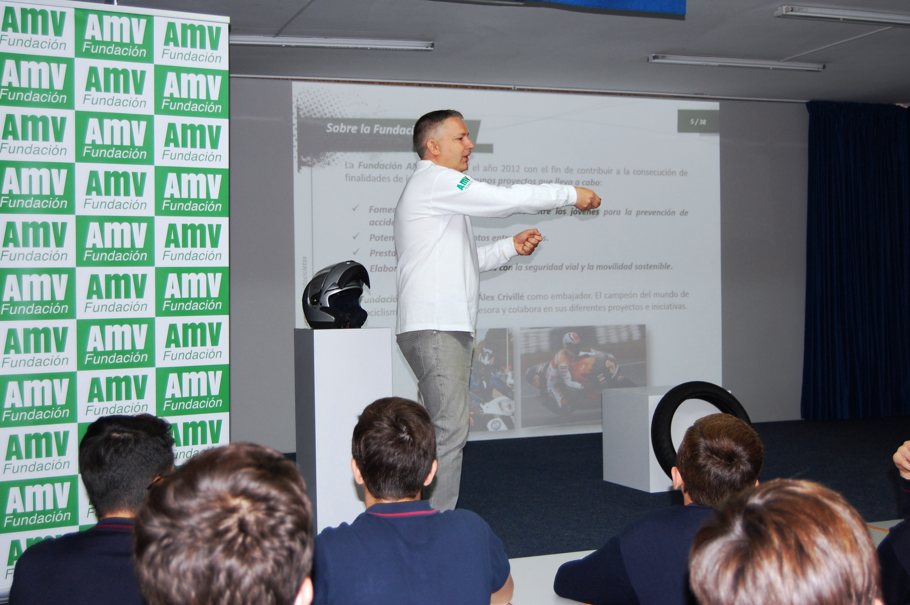 Fundación AMV imparte charlas en los colegios sobre seguridad vial a alumnos de ESO de Madrid y alrededores, con el objetivo de fomentar la conducción responsable entre los jóvenes y la prevención de accidentes. Para muchos de estos jóvenes, el ciclomotor, el scooter o la moto supondrán su primera experiencia en el ámbito de la movilidad y la Fundación les recuerda que el año pasado 500 conductores perdieron la vida en accidentes de tráfico, un 45% más que en 2016.