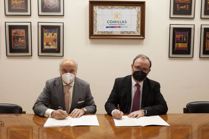 Fundación Aon España renueva su apoyo a la Cátedra de Catástrofes de la Universidad Pontificia de Comillas. El rector de la Universidad, Enrique Sanz Giménez-Rico, y Pedro Tomey, director general de la Fundación han firmado el acuerdo.