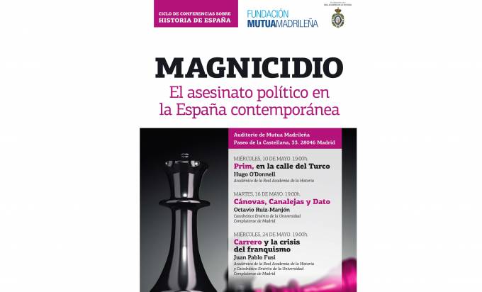 Fundación Mutua Madrileña, en colaboración con la Real Academia de la Historia, inicia a partir del miércoles 10 de mayo un ciclo de conferencias sobre Historia de España titulado ‘Magnicidio. El asesinato político en la España contemporánea’. Tres conferencias en las que se repasará la influencia en la historia reciente de España de los asesinatos de Prim, Cánovas del Castillo, Canalejas, Dato y Carrero Blanco desde finales del siglo XIX a finales del XX a manos de anarquistas, republicanos o etarras.