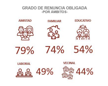 Una de las principales conclusiones del estudio es que un 79% de las personas con movilidad reducida entrevistadas se ha sentido obligada a renunciar a planes con sus amistades debido a la existencia de barreras arquitectónicas en el entorno. Y esta renuncia obligada también se ha hecho patente para un 74% de las personas con movilidad reducida en el ámbito de la familia, para un 49% en el entorno del trabajo y para el 54% en el marco de los estudios.